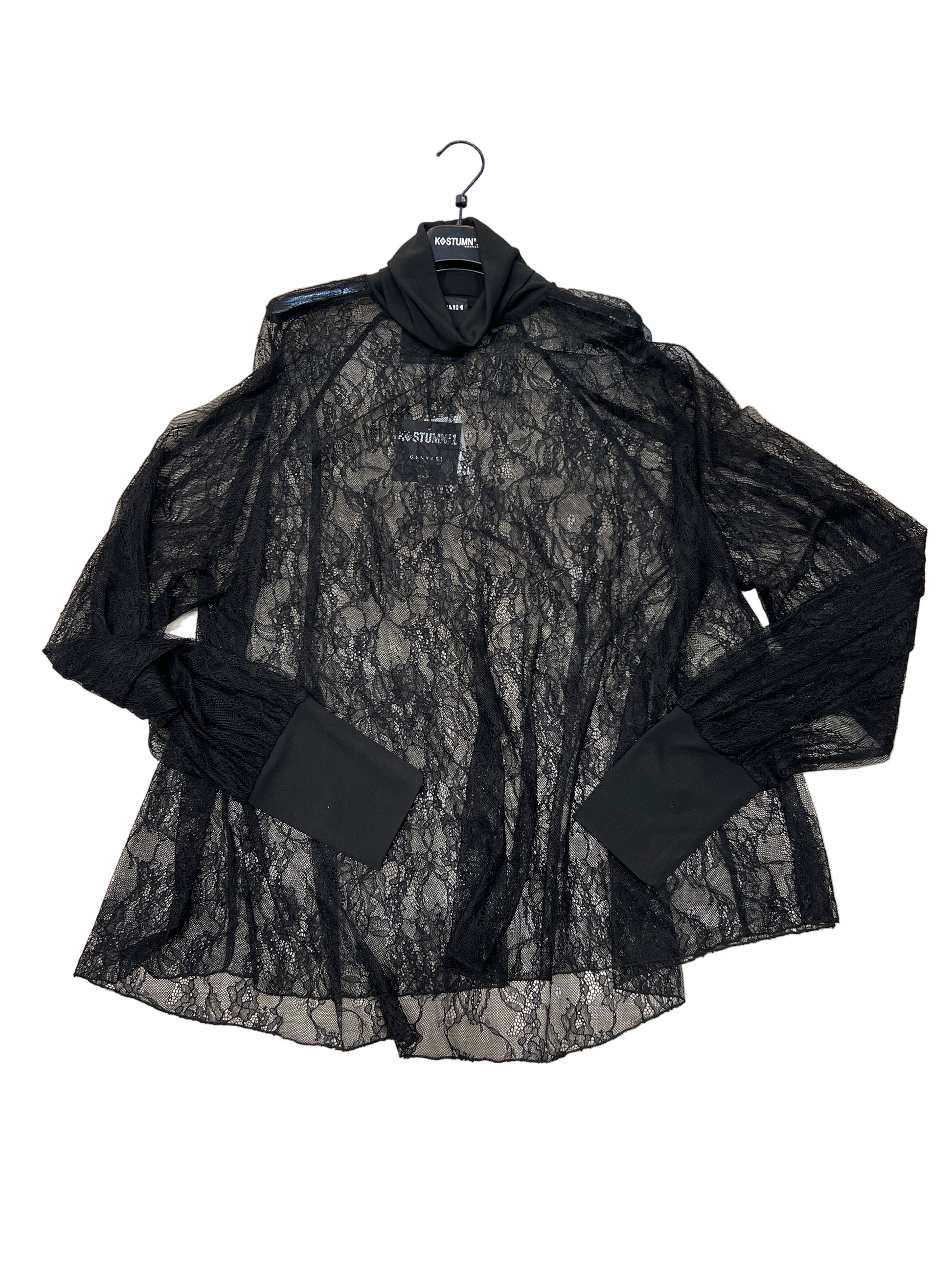 Blusa oversize in pizzo morbidissimo collo alto e polsini elasticizzati