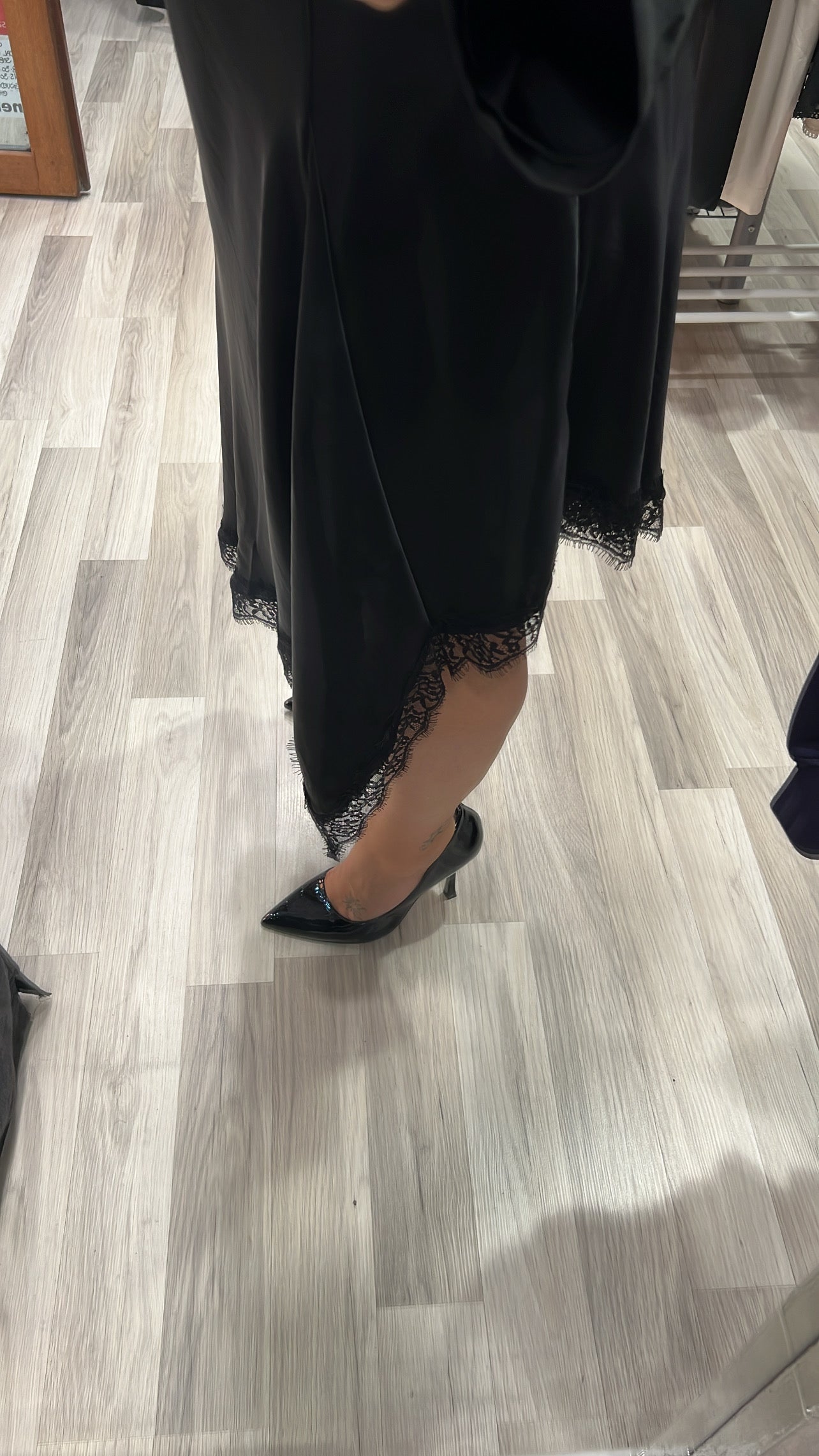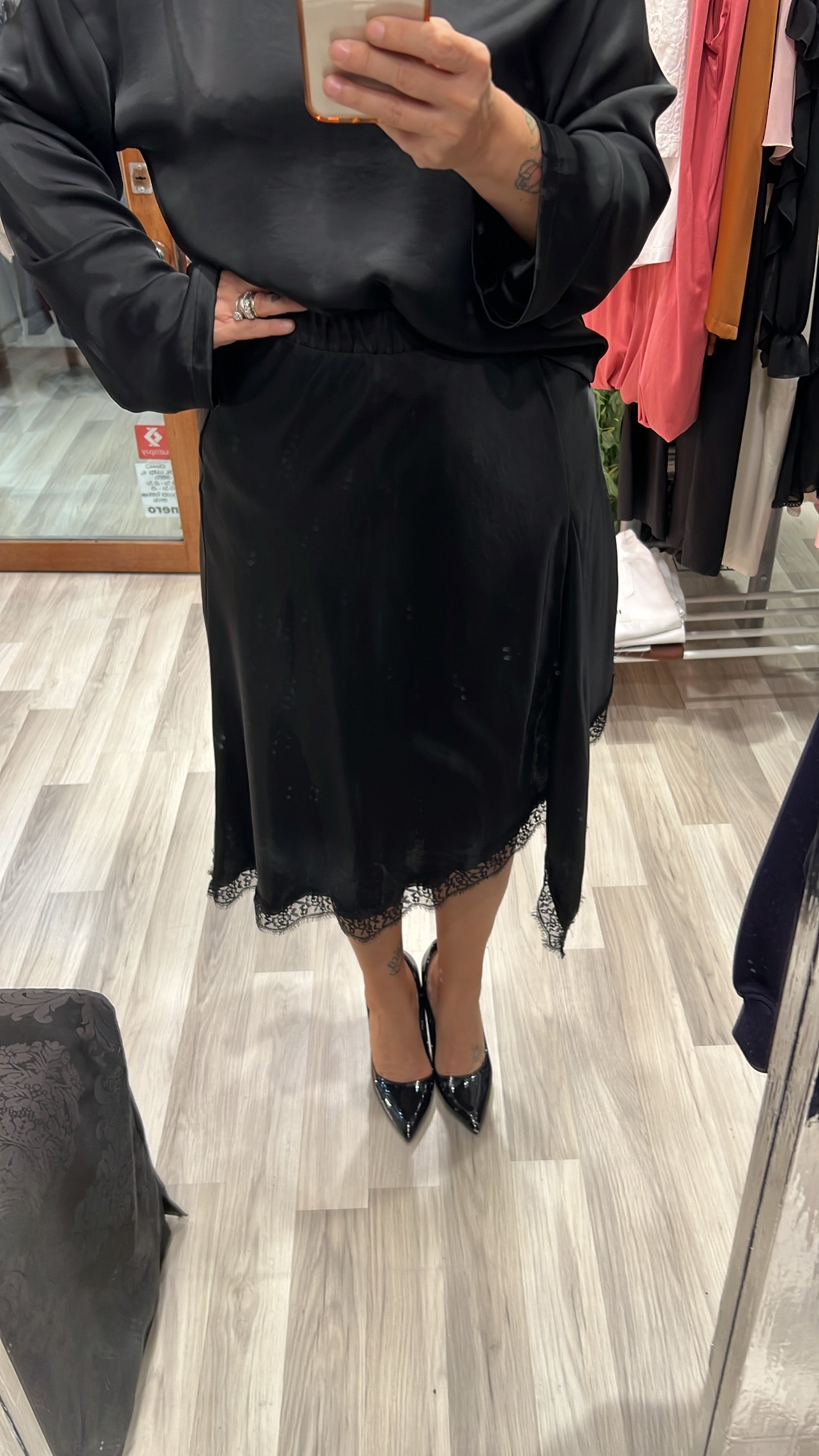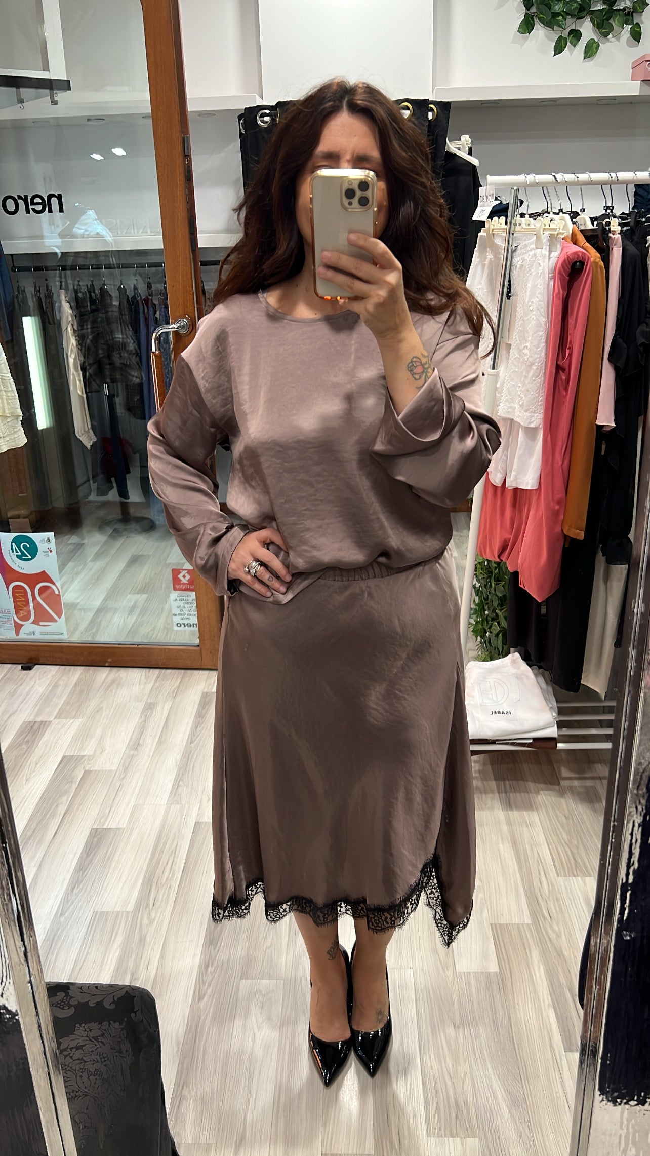 Gonna midi in raso cupra con elastico in vita e pizzo sul fondo
