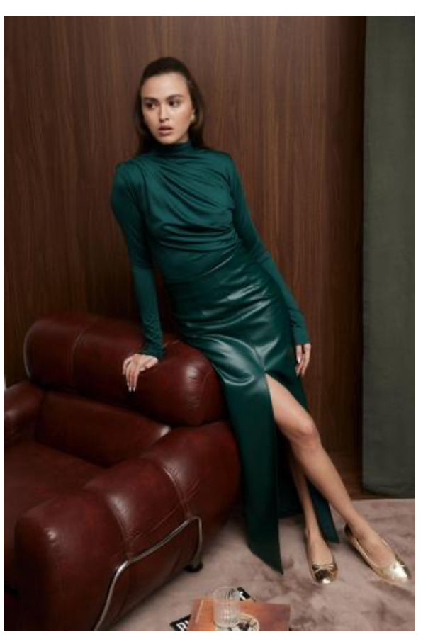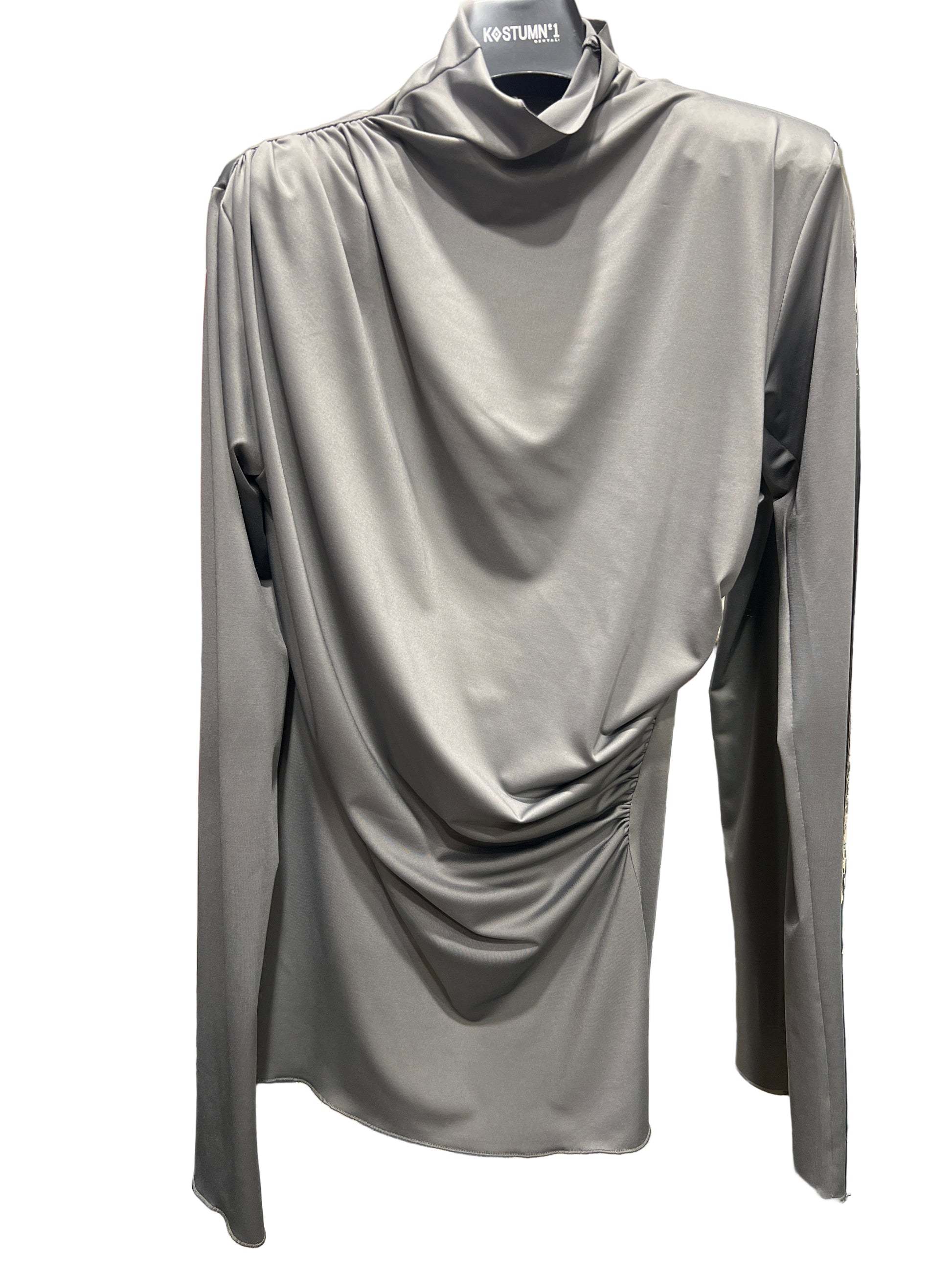 Maglia tessuto elasticizzato e morbido al tatto con drappeggio in vita e sulla spalla. Zip dietro collo