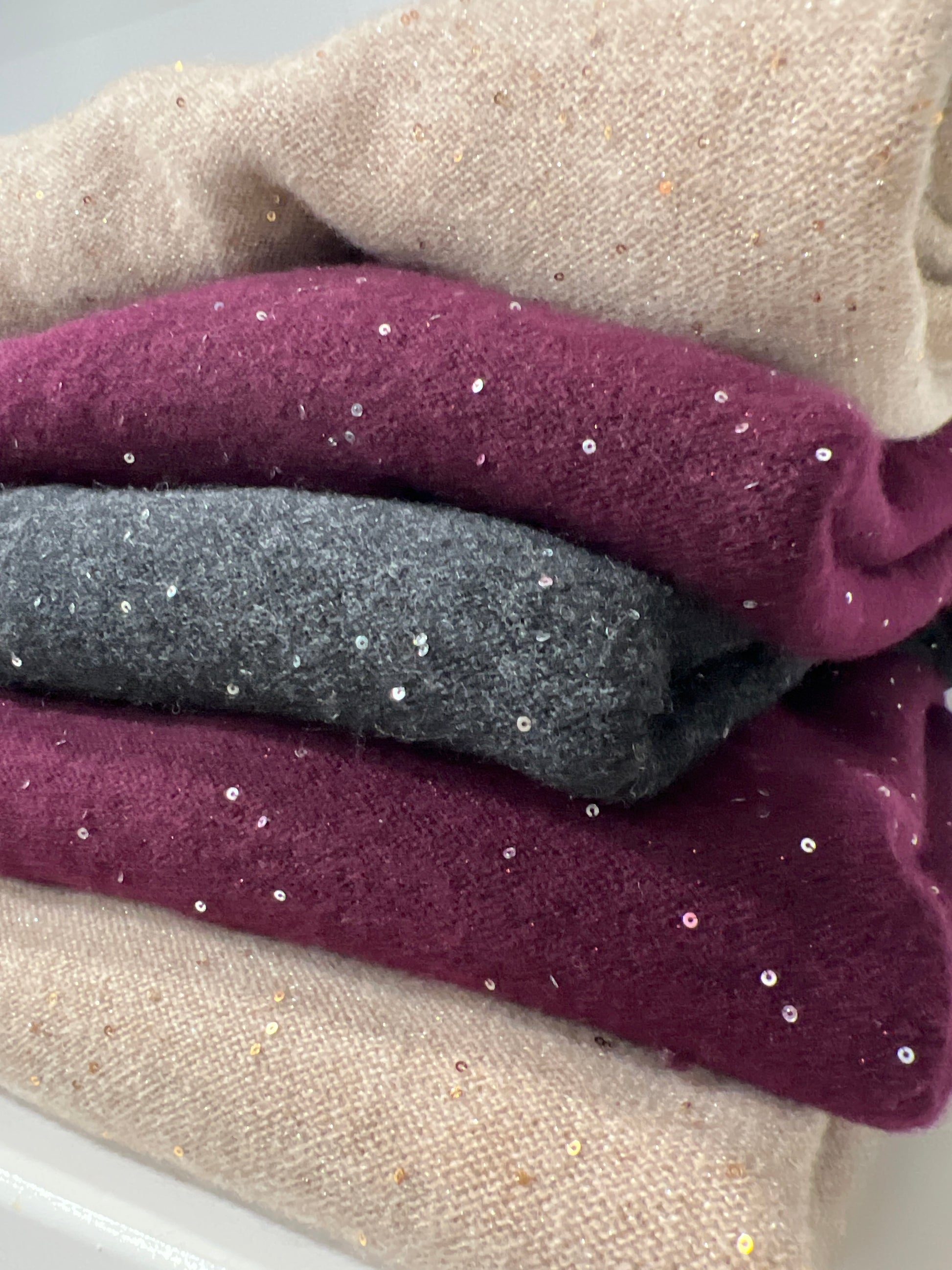 Maglia collo a V con micro paillettes misto cachemire con spacchetti laterali