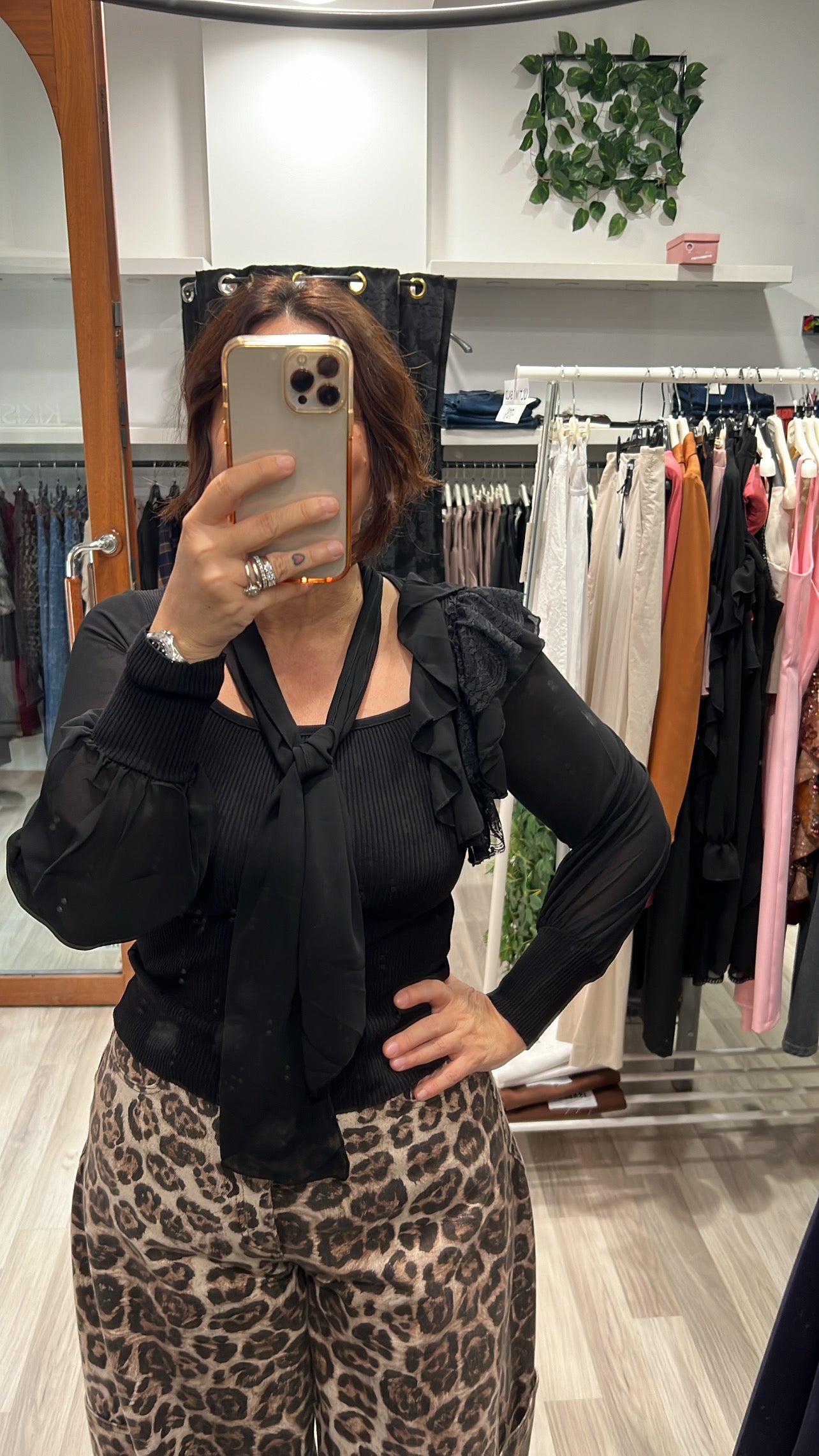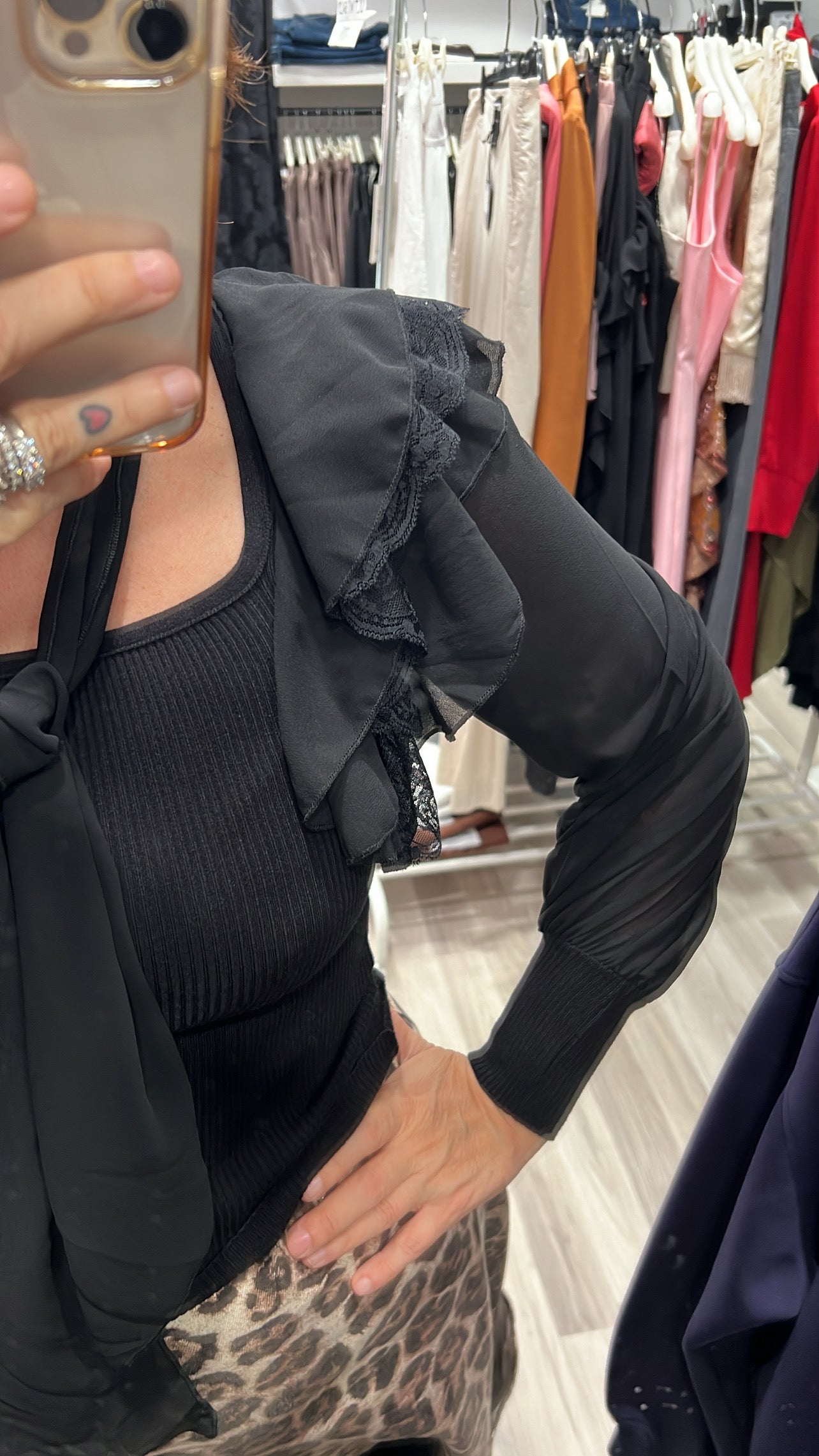 Maglia elasticizzata vestibilità aderente con manica in georgette rouches sulla spalla destra e foulard al collo