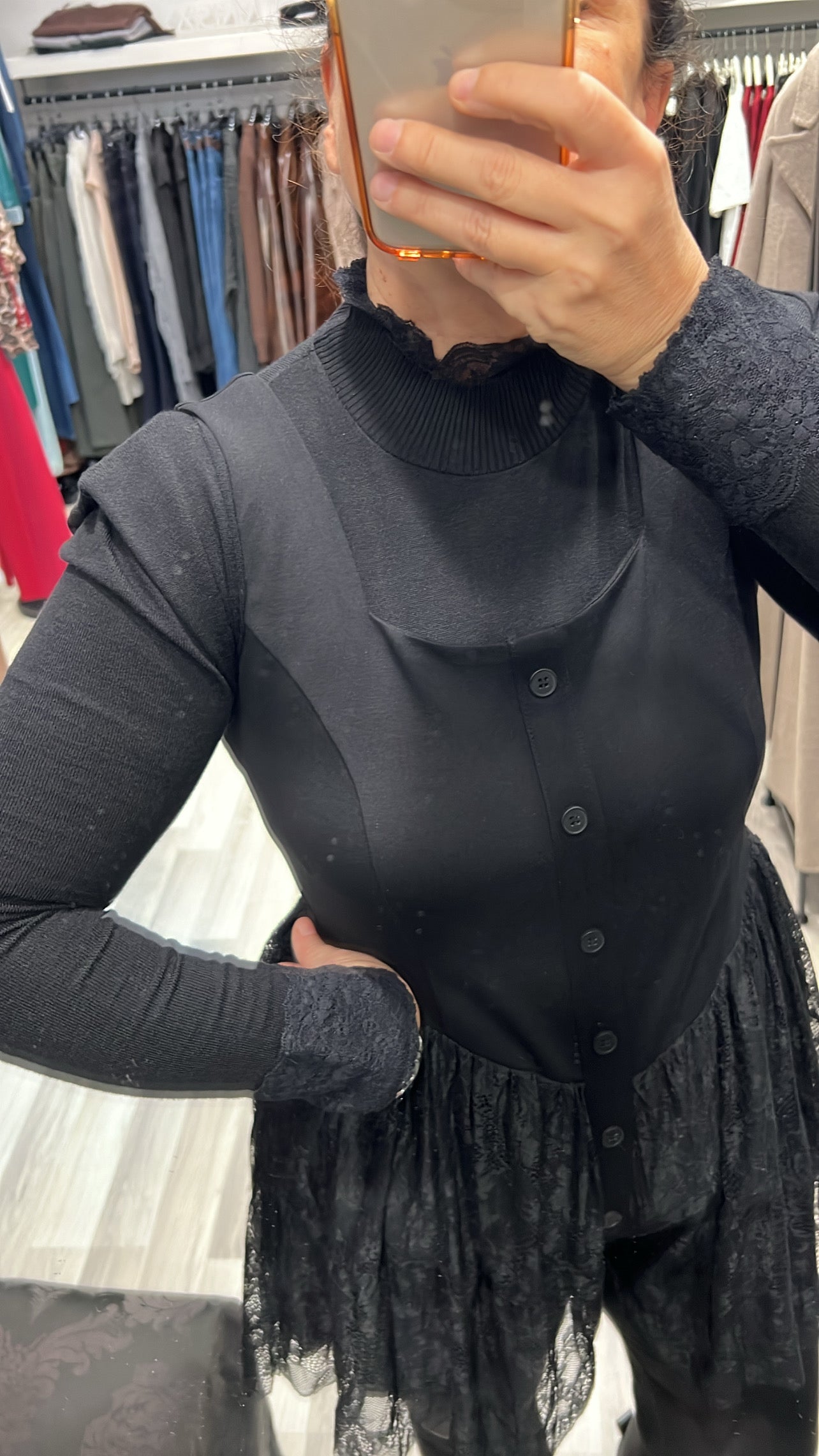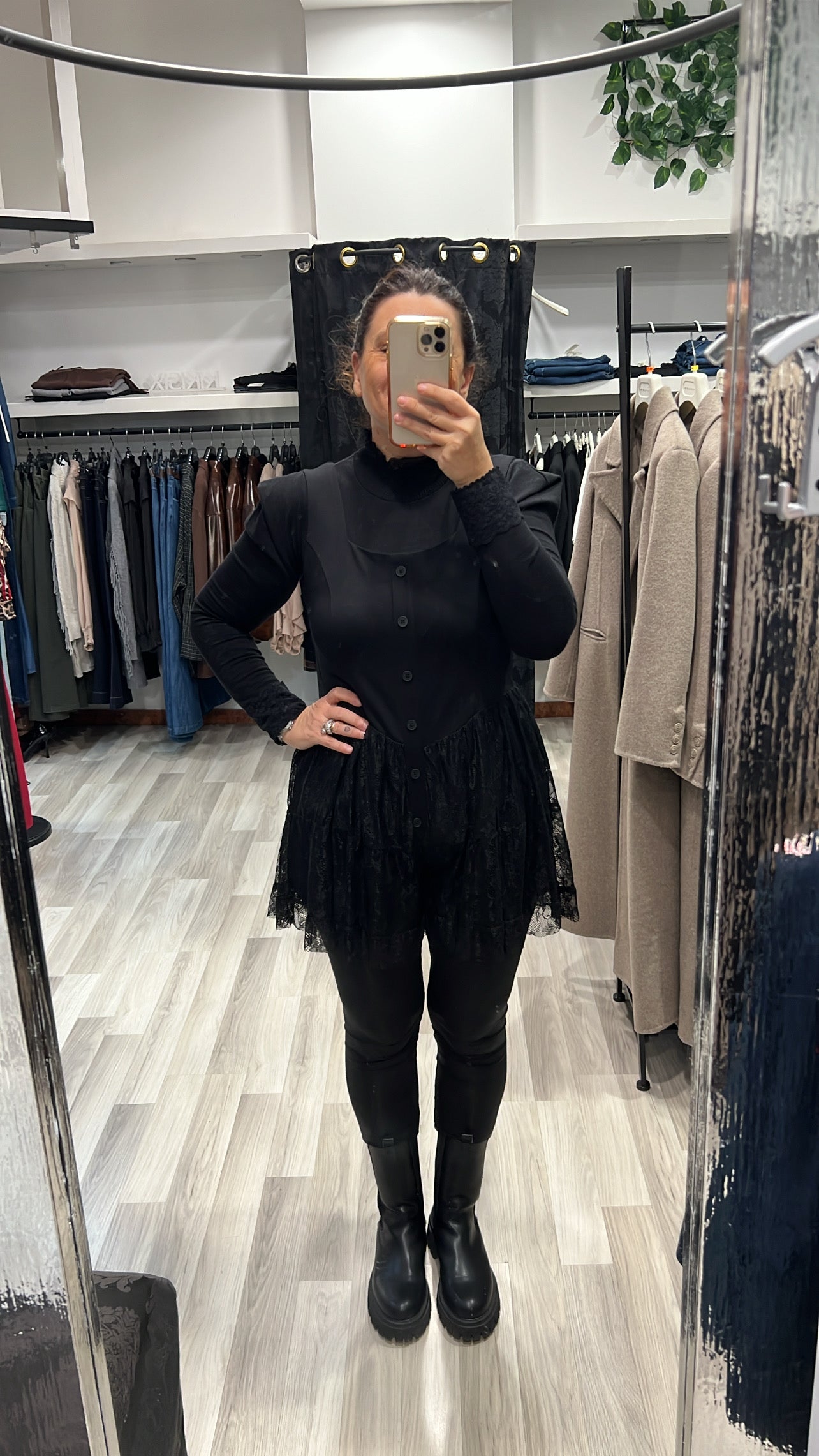 Tuta sbracciata corta con pizzo finti bottoni sul davanti chiusura dietro con zip. Vestibilità comoda